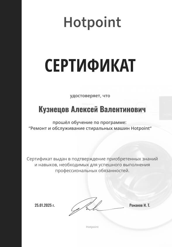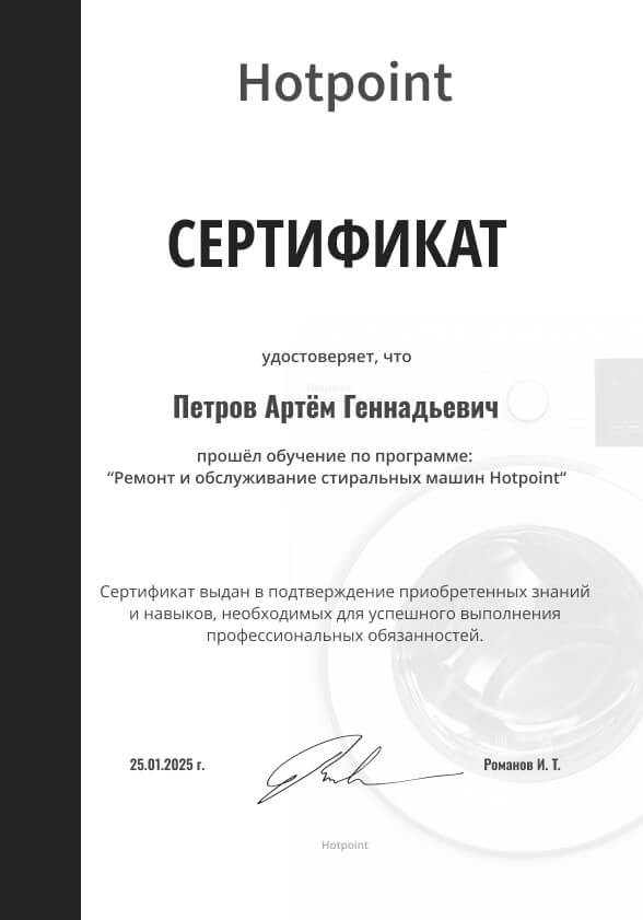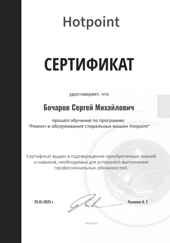 Каждый мастер в нашей компании имеет сертификаты, подтверждающие его квалификацию. Это не просто бумажки — это доказательство того, что специалист прошел обучение и знает, как работать с современными моделями стиральных машин.
